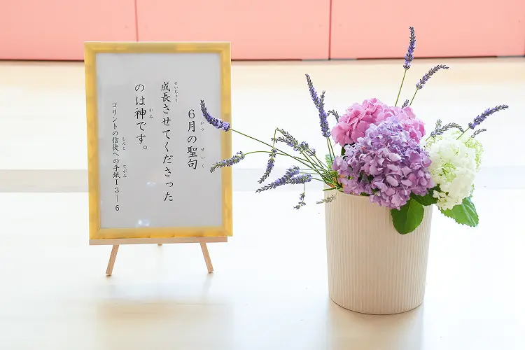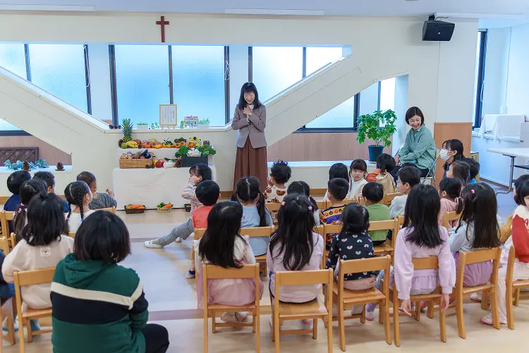※3・4・5歳児は週始めに合同礼拝をおこない聖書のお話を聞きます。